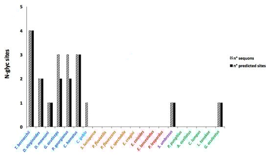Glycosylation was found to be another distinctive feature of the notothenioid pIgR. Up to four N-glycosylation sequons were found in Antarctic fish compared to the other perciform species, which showed no sequons at all, except for Sebastes umbrosus and G. aculeatus, harboring just one (Figure 9). Interestingly, the site in D2, which is present in 9 out of 12 sequences, is alternately located at two asparagines spaced by a single residue (Figure 8).