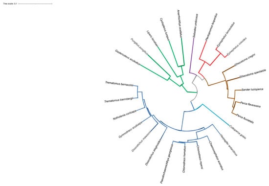 - Letunic, I.; Bork, P. Interactive Tree of Life (ITOL): An online tool for phylogenetic tree display and annotation. Bioinformatics 2007, 23, 127–128. [Google Scholar] [CrossRef]