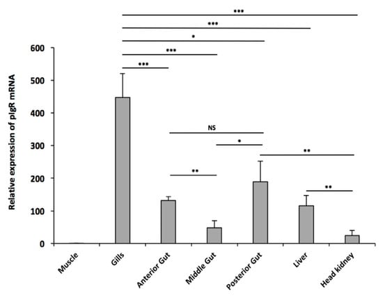 Relative expression levels of pIgR in different tissues from T. bernacchii. Data from three independent experiments are presented as mean gene expression relative to the housekeeping β-actin (±SD). The muscle tissue was used as a negative control. Levels of transcription were evaluated by q-PCR in duplicates using three T. bernacchii specimens. * p < 0.05; ** p <0.01; *** p < 0.001; NS, not significant (two-tailed Student’s t test with Bonferroni correction).