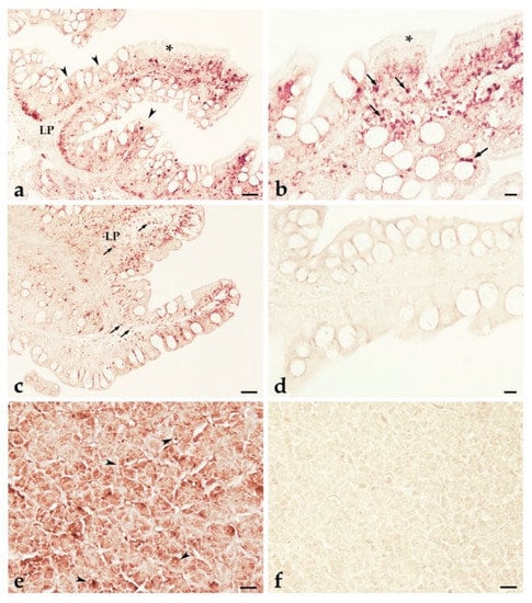 To identify pIgR-producing cells in T. bernacchii tissues, we performed ISH analysis with anti-sense and sense RNA DIG-labeled probes. Given the results obtained by q-PCR, we paid special attention to the gut–liver communication axis. The posterior intestine, which displayed higher pIgR expression levels (Figure 12), was lined by a simple columnar epithelium of polarized cells (enterocytes) (Figure 13a–d). All the enterocytes were pIgR-expressing cells (Figure 13a–c). In particular, the highest staining intensity was detected around the nucleus and on the enterocyte basolateral surface, which faces the basement membrane (Figure 13b). The apical surface of most epithelial cells did not display any staining. Scattered cells, localized both in the epithelium (Figure 13b) and the underlying lamina propria, were stained (Figure 13c). Moreover, the staining with the anti-sense probe (Figure 13e) revealed a strong signal throughout the liver. Notably, the expression of the pIgR gene was mainly detected around the nucleus of most hepatocytes. ISH with the pIgR sense probe did not result in any staining both in the posterior intestine and liver, as expected (Figure 13d–f).