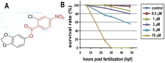 Chemical structure of X8 and toxic effects of X8 on zebrafish embryos. (A) The chemical structure of the nitrobenzoate-derived compound X8 (2H-13-benzodioxol-5-yl 2-chloro-4-nitrobenzoate) and the molecular weight is 321.7 g/mol. The red color part indicates a nitrobenzoate structure. (B) The embryos of wild-type zebrafish were treated (n = 30) with the indicated concentrations of X8 (from 0.5 to 10 μM) at 6 hpf, and survival rates at 24, 30, and 48 hpf were recorded. The survival rate at 6 hpf was defined as 100%.