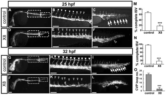 X8 treatment impairs vascular development during zebrafish embryogenesis. (A–F) Lateral view of X8-treated Tg(flk:eGFP) embryos at 25 hpf (D) showing decreased ISV growth to the top of the embryo (hollow arrowheads in (E)) and decreased or a complete absence of angiogenic sprouting from the caudal vein (hollow arrowhead in (F)) compared with those parameters in wild-type control embryos ((A), arrowheads in (B), and arrows in (C)). (A,D) Fluorescent images of whole larvae; (B,E) and (C,F) are enlargements of the truck and tail regions of (A,D). (G–L) At 32 hpf, in untreated control embryos, ISVs reached the DLAV ((G) and arrowheads in (H)), and the CVP formed honeycomb-like loop structures at the tail ((I), arrows). Meanwhile, ISVs were stalled in mid-somite in X8-treated embryos ((J) and hollow arrowheads in (K)), and decreased endothelial cell sprouting and loop formation at the CVP (hollow arrowhead in (L)) were observed. (H,I) are enlargements of the truck and tail regions of (G) and (K,L) are enlargements from (G). (M) Quantification of the percentage of complete ISV structures showed a 3.5-fold decrease in X8-treated fish at 25 hpf. (N,O) Quantification of the percentages of complete ISV and CVP structures in X8-treated fish at 32 hpf showed reductions of ~5.2-fold and ~6-fold, respectively (n = 25 for control and n = 27 for X8 samples). *** p < 0.0001 by unpaired Student’s t-test. Scale bars: 200 μm in (A,D,G,J); 100 μm in (B,C,E,F,H,I,K,L).