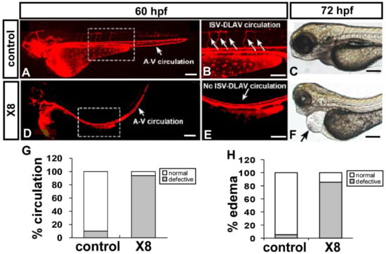 We observed vascular growth defects at 25–32 hpf in X8-treated embryos. It has been reported that edema and lack of circulation are side effects of vascular malformation; therefore, we first examined the blood flow in wild-type zebrafish embryos and X8-treated transgenic Tg(gata1:dsRed) embryos with blood cell-specific dsRed fluorescent expression. At 48–72 hpf, X8 treatment caused an increase in pericardial edema and circulatory defects. In addition, ~93% of X8-treated embryos exhibited slow to no circulation in the primary axial vessels and/or at the ISV-DLAV part at 60 hpf (n = 24 for control and n = 22 for X8-treated embryos) (Figure 3A,B,D,E,G). At 72 hpf, ~82% of embryos showed pericardial edema, a higher percentage than that of wt control embryos (5%) (Figure 3C,F,H). These data were correlated with the vasculature defects in X8-treated fish.