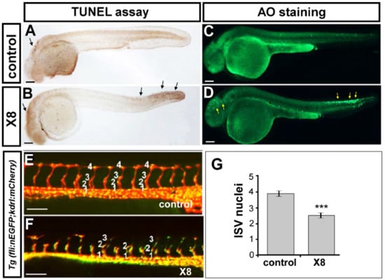 X8 treatment inhibited the growth of ISV cells. (A–D) A TUNEL assay and AO staining were used to assay apoptotic cells in wild-type (A,C) and X8-treated embryos (B,D) at 30 hpf. An increase in apoptotic cells was observed close to the head and tail regions in X8-treated embryos compared with untreated control embryos (B,D), but no increase was observed in vascular regions (E,F). The number of cells forming each ISV was counted in control (E) and X8-treated (F) Tg(kdrl:mCherry; fli1a:negfp)y7 embryos at 30 hpf. (G) Average number of endothelial cells per ISV: 3.9 ± 0.4 (n = 80) and 2.5 ± 0.4 (n = 60) in wild-type and X8-treated embryos, respectively. *** p < 0.0001 by unpaired Student’s t-test. Scale bars: 100 μm in (A–F).