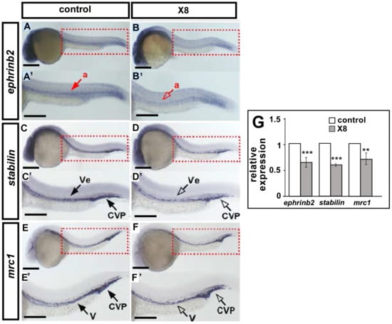The vascular defects in the growth of ISV and the formation of CVP suggested that X8 treatment affects important processes in vascular development. Therefore, we analyzed the expression levels of vascular markers at 24 hpf by whole-mount in situ hybridization and quantitative PCR (qPCR). The expression levels of the arterial marker ephrinb2, venous marker mrc1, and panvascular marker stabilin were decreased in the trunk and CVP of X8-treated embryos compared with wild-type embryos (Figure 5A–F,A’–F’). The decreased expression levels of vascular markers were also quantified by quantitative PCR (qPCR), and a significant 30–40% decrease in expression was found in X8-treated embryos (Figure 5G). These results suggest that X8 treatment downregulates the expression of vascular-associated genes to attenuate vessel formation.
