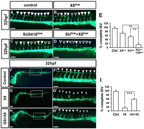 Interaction between X8 and VEGF signaling. (A–E) Enhanced effects of vascular defects in embryos cotreated with X8 and SU5416. At 32 hpf, in untreated control embryos (A), ISVs reached the DLAV (arrowheads). ISV growth was weakly affected in embryos treated with a lower concentration of X8 (1.5 μM) (B) or a lower concentration of SU5416 (5 μM) (C). Embryos treated with the combination of X8 and SU5416 showed enhanced vascular defects in ISV growth (hollow arrowheads in (D)). (E) The quantitative analysis of ISV structures showed an enhanced reduction in X8- and SU5416-cotreated embryos (n = 20) at 32 hpf. (F–H,F’–H’) Rescue effect of the angiogenic compound GS4012 in X8-treated Tg(flk:egfp) zebrafish embryos. Embryos were treated with X8 (3 μM) in combination with (H,H’) or without (G,G’) GS4012 (1 μg/mL) at 6 hpf and were then imaged at 32 hpf. The percentage of complete ISV structures is quantified in (I). The data are presented as the mean ± SD values (n = 20). The asterisks indicate statistical significance versus control embryos. ** p < 0.001 and *** p < 0.0001 by unpaired Student’s t-test. Scale bars: 100 μm in (A–D,F’–H’); 200 μm in (F–H).