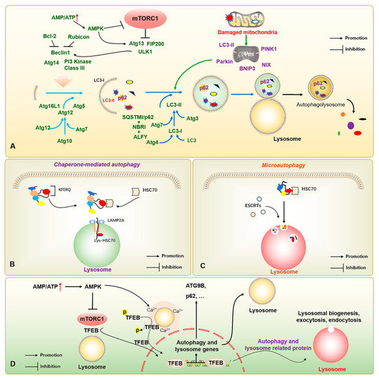 In addition, there are molecular chaperone-mediated autophagy and microautophagy. Of these, molecular chaperone-mediated autophagy does not depend on the vesicle delivery of metabolic wastes, but mainly on the specific recognition of pentapeptide motif (KFERQ) target proteins and receptor proteins on the lysosomal membrane by the chaperone protein heat shock cognate 70 kDa protein (HSC70) [18]. When the target protein binds to the lysosome-associated membrane protein 2A (LAMP2A) and enters the lysosome, Lys-HSC70 is responsible for mediating the transport of the degradation substrate in the lysosome to finally be degraded into basic components for recycling under the action of hydrolase (Figure 1B). During endosomal microautophagy, HSC70 binds to proteins carrying a KFERQ protein or KFERQ-like motifs and relies on endosomal sorting complexes required for transport (ESCRT)-I/II/III to achieve substrate transfer (Figure 1C). The heteromers of ESCRT-I and ESCRT-II and the monomers of ESCRT-III can be degraded intracellularly. When ESCRTs are recruited to the lysosomal membrane to form a complex, they induce the invagination of lysosomal membrane to wrap the substrate into the lysosome for degradation. When the lysosomal membrane encapsulates the substrate into the lysosome, ESCRT-III dissociates from the complex for recycling. Notably, autophagy-related transcription factors, such as the transcription factor EB (TFEB), also play important roles in regulating autophagic vesicle formation, lysosomal regeneration, and vesicle-lysosome binding, while transcription factors including the TFEB also play an important role in the regulation of autophagy [19] (Figure 1D). However, with the refinement of research in the field of autophagy, more signal pathways, underlying mechanisms, and regulatory proteins associated with autophagy have been discovered [20], which also offer the possibility for more refined regulation of autophagy.