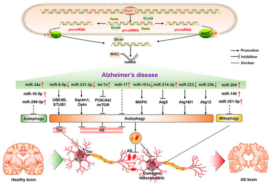 The molecular mechanisms of miRNA-mediated autophagy in AD. The ↑ and ↓ in red color represent the up-regulated and down-regulated microRNAs, respectively. The → and ┤ in black color represent the promotion and inhibition, respectively; the ┈ in black color represents the unclear promotion or inhibition.