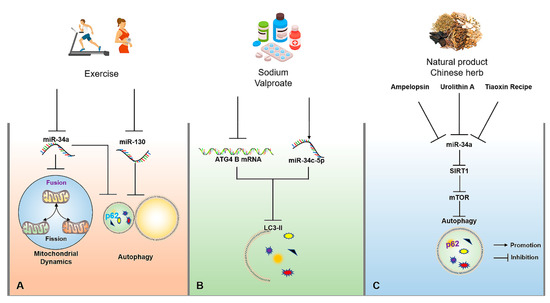 The molecular mechanisms of miRNAs for regulating autophagy in AD upon exercise, drug, natural product and traditional Chinese herb interventions. (A) Appropriate exercise can improve mitochondrial dynamics by inhibiting miR-34a and activate autophagy by inhibiting miR-34a and miR-130. (B) Sodium valproate can reduce the expression of LC3-II by up-regulating the expression of miR-34c-5p and reducing the stability of ATG4B mRNA. (C) Tiaoxinfang, Ampelopsin and urolithin A can delay brain aging through the activation of autophagy by inhibiting miR-34a/SIRT1/mTOR signaling pathway. The → and ┤ in black color represent the promotion and inhibition, respectively.
