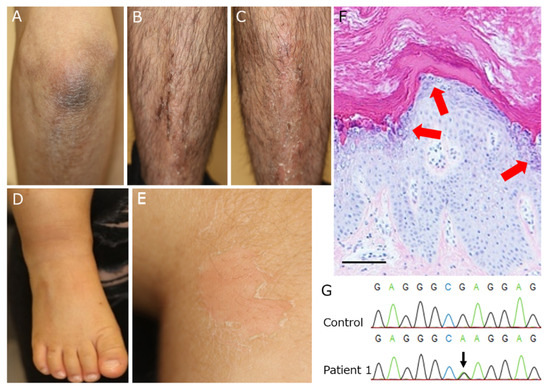 Clinical and histopathological features of the present patients and the causative KRT2 mutation. (A–C) In Patient 1, brown, hyperkeratotic lesions with scaling are observed on the elbow (A) and the lower legs (B,C). (D) In Patient 2, light gray, hyperkeratotic lesions are seen on the extensor side of the ankle joint and the dorsa of the right foot. (E) A superficial denuded area, called “Mauserung phenomenon”, is also observed on the flexor side of the knee of Patient 2. (F) Histopathological observations of the hyperkeratotic skin on the anterior lower leg of Patient 1 reveal significant hyperkeratosis and granular degeneration restricted to the upper spinous and granular layers of the epidermis (scale bar: 50 μm). (G) Sanger sequencing confirms the heterozygous mutation within KRT2, c.1459G>A (p.Glu487Lys), in Patient 1.