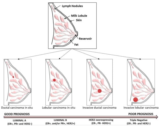 BC is the most common type and leading cause of cancer death among women []. The origin of BC is complex, because several genetic and epigenetic changes are involved, which are the cause of the known histopathological–clinical heterogeneity of this cancer []. Intertumoral heterogeneity has led to a classification based on expression profiles of key molecular markers, such as ER, PR, and HER2 []. Hence, BC is classified into four subtypes considering their receptor statuses: luminal A (ER-positive, PR-positive, and HER2-negative); luminal B (ER-positive and/or PR-positive, HER2-positive); HER2 overexpressing (ER-negative, PR-negative, and HER2-positive); and triple negative (ER-negative, PR-negative, HER2-negative) (Figure 1).