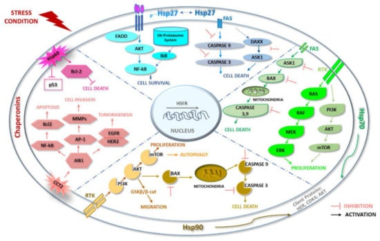 Hsp27 (HSPB1) is a CS member belonging to the sHsp family (≤34 kDa) and is a redox-sensitive molecular chaperone. The primary structure of Hsp27 is highly homologous to other members of the sHsp family that bear the conserved α-crystallin domain (ACD) and variable-length N- and C-terminal regions (NTRs and CTRs, respectively) []. Hsp27 is an ATP-dependent chaperone that folds substrate proteins and participates in shuttling destabilized or misfolded proteins toward proteolytic degradations []. Hsp27 is cytoprotective; it blocks apoptosis through interaction with various factors active in the apoptotic pathway []. The inhibition of apoptosis is required in the heat shock response (HSR) for cells to survive transient stress-induced apoptosis accompanied by the Hsp-mediated refolding of damaged proteins [] (Figure 2).