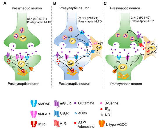 Schematic summarizing the role of mGluR I in different forms of STDP, showing that two different large sets of STDP forms could be proposed according to the underlying mechanism for coincidence detection: (A) In a classic model of Hebbian STDP, postsynaptic NMDARs are the main coincidence detectors (providing strong and brief Ca2+ signals) that drive postsynaptic forms of t-LTP and could also involve postsynaptic VGCCs, postsynaptic mGluRs and IP3R-mediated increase in postsynaptic Ca2+ [30,33,34,47,50]. This model does not fully support the mechanism underlying postsynaptic NMDAR-dependent t-LTD at horizontal layer 2/3-layer 2/3 synapses of the primary somatosensory cortex [36]. Consequently, more research needs to be performed. In turn, other findings support the proposed model involving the mGluR-VGCC-IP3R pathway in presynaptic forms of t-LTD as shown in B and t-LTP as shown in C as representative examples. In these studies, presynaptic forms of STDP either involve non-postsynaptic and likely presynaptic NMDARs and eCBs as retrograde signal driving to t-LTD, as represented in B, [34,47] or NO retrograde signal driving to NMDAR-independent t-LTP, as represented in C [44]. In addition, astrocytes release D-serine for t-LTD at P13-P21 (B) and ATP/adenosine for t-LTP at P35-42 (C). The presence and involvement of astrocytic mGluRs in diverse forms of STDP should not be discarded and deserve further experimental efforts. Note that at hippocampal area CA1, a developmental switch occurs: when the postsynaptic activity precedes the presynaptic activity (∆t < 0) at P13-21, presynaptic t-LTD is induced (B) whereas presynaptic t-LTP is induced by the same protocol at older ages (P35-P42) (C) with astrocytes commanding the closing and opening of these plasticity windows [44,46]. Such general models represented in (A–C) are constantly evolving and, therefore, must be revisited considering future advances. (-): decrease in glutamate release in the presynaptic form of t-LTD, (+): pathways that are activated, (?): mechanistic insights that are yet to be demonstrated.