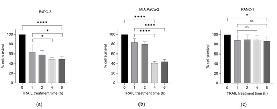 Effect of gemcitabine and TRAIL treatment on PDAC cell survival. The sensitivity of BxPC-3, MIA PaCa-2 and PANC-1 cells to the combination treatment was assessed using MTT assays. (a) BxPC-3, (b) MIA PaCa-2 and (c) PANC-1 cells were treated with 100 µM gemcitabine for 24 h and 100 ng/mL TRAIL for the final 0, 1, 2, 4, and 6 h of the gemcitabine treatment (n = 4). All experiments were repeated three times, and data are provided as means ± SD. One-way ANOVA followed by a post-hoc Dunnett’s test was used to determine statistical significance between gemcitabine alone or gemcitabine with 1 h of TRAIL and longer time periods with TRAIL: * p < 0.05, **** p ≤ 0.0001.