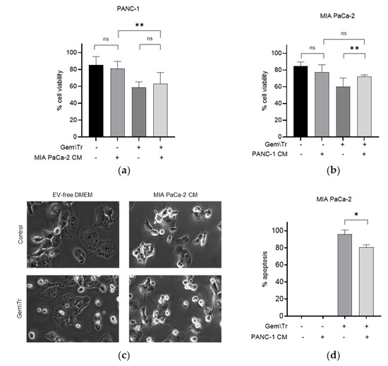 CM derived from untreated PANC-1 cells was included during the treatment of MIA PaCa-2 cells with 100 µM gemcitabine and 100 ng/mL TRAIL. The effect of this CM on cell viability is shown in Figure 2b,d. Here, it can be seen that in the presence of PANC-1-derived CM, MIA PaCa-2 cells were more resistant to treatment with gemcitabine and TRAIL, as denoted by the significant increase in the cell viability (72.2% cell viability versus 60.0% cell viability without CM; Figure 2b). Concordantly, there was also a significant decrease in the percentage of MIA PaCa-2 cells undergoing apoptosis under these conditions, as determined using time-lapse microscopy, (80.8% of cells versus 95.8% of cells without PANC-1 CM; Figure 2d).