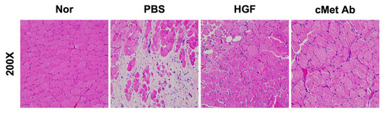 The expression levels of c-Met in TA muscles were evaluated. c-Met expression was significantly decreased in the PBS group compared to normal controls, while it was insignificantly increased in the HGF and c-Met groups (Figure 3).