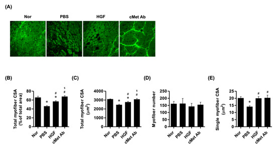 The cross-sectional areas (CSAs) of the TA muscles were analyzed in each group. The PBS group had significantly decreased intrinsic muscle CSA compared to normal controls, while the HGF group had increased CSA compared to the PBS group, although it was still lower than in the control group. The c-Met group had significantly increased CSAs compared to the PBS and HGF groups, with no significant differences compared to controls. There were no differences in myofiber numbers among the groups, but the single-myofiber CSAs were increased in the HGF and c-Met groups compared to the PBS group (Figure 2).