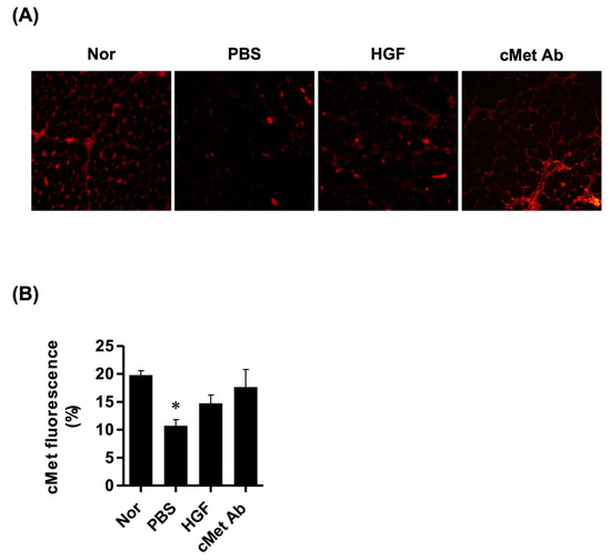 Analysis of c-Met expression in laryngeal muscles. (A) Representative images of c-Met staining (original magnification: 200×). (B) Relative intensity of c-Met fluorescence. * p < 0.05 compared to Nor (normal).