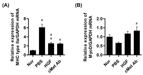 Results of real-time PCR of myogenesis-related genes. (A) The expression level of myosin heavy chain IIa. (B) The expression level of MyoD. * p <0.05 compared to Nor (normal); # p <0.05 compared to PBS.