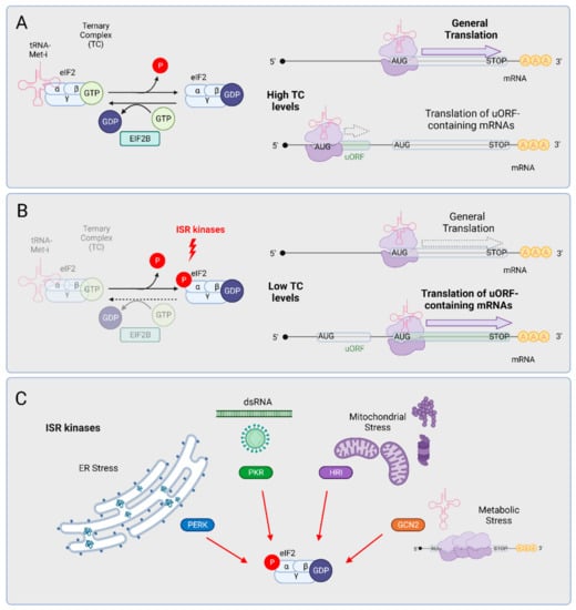 ISR kinases reprogram cellular translation by regulating TC levels through eIF2α phosphorylation. (A) After translation initiation, eIF2B recycles the eIF2 complex by exchanging GDP by GTP and favoring high TC levels. Under this situation, the translation of most mRNAs (general translation) is promoted and on the contrary, uORFs-containing mRNAs translation is non-favored. (B) Under stress conditions, the ISR kinases phosphorylate the alpha subunit of eIF2, blocking the eIF2B-mediated GDP/GTP exchange. As a consequence, the recycling of the eIF2 complex is impeded and TC levels are low. In this case, general protein translation is inhibited but the translation of uORFs-containing mRNAs is favored. (C) Each one of the four ISR kinases is activated by a specific type of stress. Endoplasmic Reticulum (ER) stress caused by misfolded proteins activates PERK, whereas endogenous or viral double-stranded RNAs (dsRNAs) activate PKR. Cytosolic protein aggregation, and proteasome and mitochondrial dysfunction activate HRI. Finally, metabolic stress (such as amino acid starvation or ribosomal stalling) promotes GCN2 activation. Importantly, the activation of all kinases converges on eIF2α subunit phosphorylation, causing a gene remodeling program that relies upon uORFs-containing mRNAs privileged translation. Created with BioRender.com.