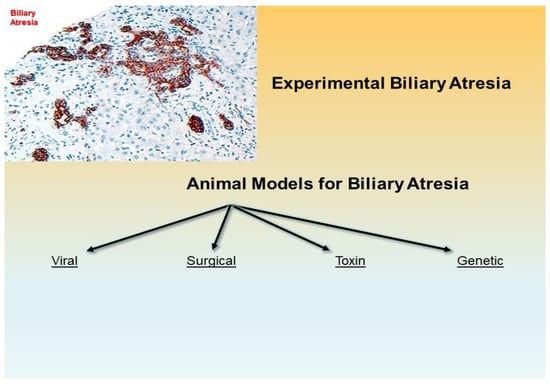 Classical methodologies used to investigate the components of BA in experimental animal models include several approaches. They include dissecting and histopathological studies of liver or hepatobiliary tissues by immunohistochemical staining. In addition, Western blots, real-time PCR, adoption techniques (e.g., of the T cells from RRV-diseased mice into naïve syngeneic severe combined immunodeficiency recipients), apoptosis, and autophagy have been added. Pathological characteristics usually scored for BA in models involve liver tissue necrosis (inflammation, apoptosis scoring) and morphological changes in the biliary tract, such as bile duct inflammation, and anatomical or inflammatory profiles of portal/periportal regions. In addition, levels of total serum and conjugated bilirubin, fibrosis, liver functions, viral load, or replication in liver tissues are also considered. You et al. developed a genetic method to investigate the pathogenesis of BA. The gene expression profile of BA was downloaded from the Gene Expression Omnibus (GEO) database. It included 18 samples from newborn mice. These samples were collected at three time points after the induction of BA with rhesus rotavirus. The differentially expressed genes (DEGs) were identified using the limma package in R language, followed by hierarchical clustering analysis. The authors used gene ontology functional analysis and Kyoto Enrichment of Genes and Genomes pathway analysis of the selected common DEGs. Six common DEGs (CCL3, CXCL5, CXCL13, CXCR2, CCL5, and CCL6) were recognized that were involved in the significantly enriched functions and the significantly enriched pathways. These genes may be used for future experimental models of BA [].