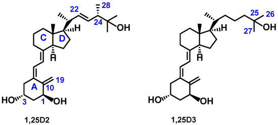 1,25-dihydroxycholecalciferol (1,25-dihydroxyvitamin D3, calcitriol, 1,25D3) and 1,25-dihydroxyergocalciferol (1,25-dihydroxyvitamin D2, 1,25D2) (Figure 1) are no longer considered just as “vital amines” [1,2] that maintain the calcium and phosphate homeostasis [3], they are also pleiotropic hormones [4] that regulate key physiological processes [5,6]. Several active vitamin D metabolites, their precursors, and synthetic analogs are used as drug substances in the treatment of bone diseases (type I rickets, osteomalacia, hypoparathyroidism, pseudohypoparathyroidism, renal osteodystrophy, and osteoporosis), and hyperproliferative skin diseases such as psoriasis [7,8]. Efforts are now focused on fortifying standard anticancer chemotherapy by the addition of synthetic vitamin D analogs to improve efficacy and delay cancer recurrence [9]. The active forms of vitamin D3 (1,25D3) and D2 (1,25D2), jointly denoted as 1,25D, cannot be used for this purpose because they are highly calcaemic. They also have a low resistance to vitamin D metabolizing enzymes [10]. The current search is for vitamin D analogs of therapeutic potential against leukemia [7,11,12] and solid tumors, including breast [13], lung [14], prostate [15], colorectal [16,17], skin [18], and ovarian cancer [19]. We have developed analogs of 1,25D that exceed the potency of the parent 1,25D against cancer cells in vitro and in vivo, and that are less calcaemic and more enzymatically stable [10].