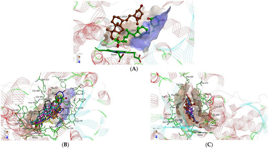 Based on the experimental data obtained for the metabolic conversion of 1,25D3 analogs by the CYP24A1 enzyme, we examined the nature of the mode of action that can be created between analogs and the CYP3A4 enzyme. This was investigated for the PRI-1901 and PRI-2205 analogs of 1,25D3 by using the human CYP3A4 model (see Figure 9). The calculated binding free enthalpy values for PRI-1901 and PRI-2205 were −62 kcal/mol and −64 kcal/mol, respectively (compared to −29 kcal/mol for 1,25D3). The interactions inside the complexes of PRI-1901 and PRI-2205 are shown in Figure 9 and Figure S4 in the Supplementary Materials.