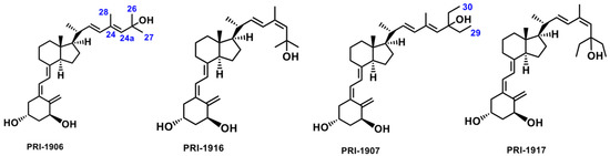 Structural formulas of the analogs of 1α,25-dihydroxyvitamin D2 (PRI-1906, PRI-1907, PRI-1916, and PRI-1917).