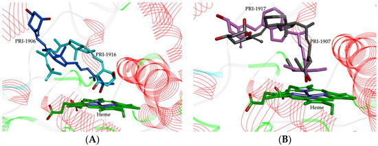 The parallel arrangement of the A- and CD-rings to the heme group is conducive to the formation of very strong hydrogen bonds by the A-ring hydroxyls with the amino acid residues Ala-370, Arg-372, Glu-374, and Gly-481 in CYP3A4 (see Figure 5 and Figure S1 in Supplementary Materials). Furthermore, the 1- and 3-hydroxyl of PRI-1907 formed hydrogen bonds with water molecules. In contrast, the docked analog PRI-1917, with (24Z)-25-diethyls in the side-chain, showed the perpendicular arrangement of A- and CD-rings to the heme group that caused only the 1-hydroxyl to be involved in a hydrogen bond with amino acid residue Gly-481. This could lead to a lower affinity of PRI-1917 for the CYP3A4 cavity compared to that of PRI-1907 (see Figure 5 and Figure S1 in Supplementary Materials).