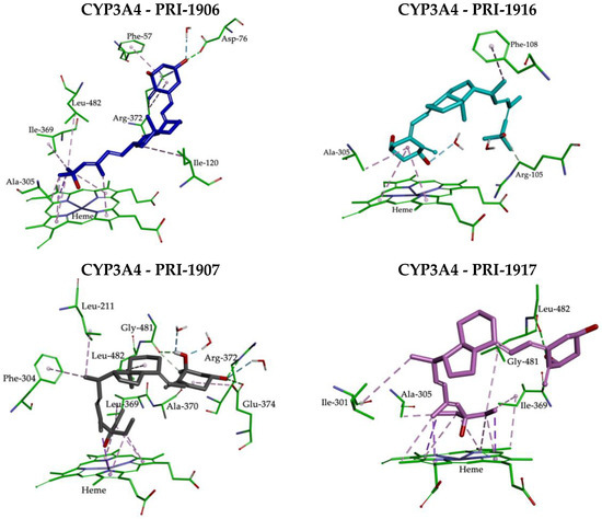 Molecular interactions between 1,25D2 analogs (PRI-1906, PRI-1907, PRI-1916, and PRI-1917) and CYP3A4 resulting from MD simulations. Hydrophobic interactions are shown as magenta dashed lines and hydrogen bonds as green.