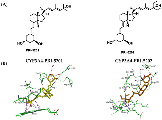 (A) Structural formulas of the analogs of 1α,25-dihydroxyvitamin D2 (PRI-5201 and PRI-5202). (B) Molecular interactions between 1,25D2 analogs (PRI-5201 and PRI-5202) and CYP3A4 resulting from MD simulations. Hydrophobic interactions are shown as magenta dashed lines and hydrogen bonds as green.