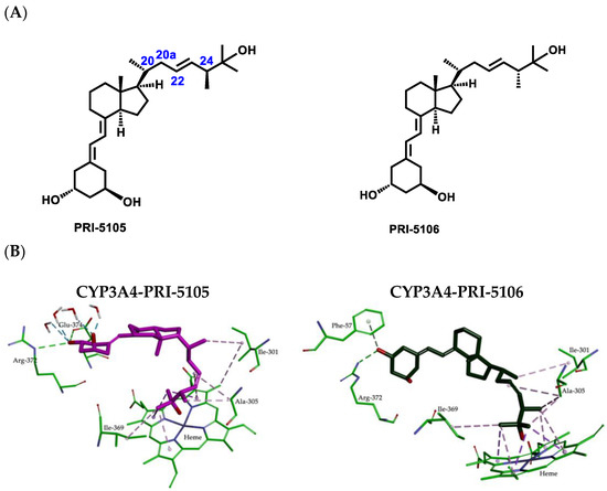 (A) Structural formulas the analogs of 1α,25-dihydroxyvitamin D2 (PRI-5105 and PRI-5106). (B) Molecular interactions between 1,25D2 analogs (PRI-5105 and PRI-5106) and CYP3A4 resulting from MD simulations. Hydrophobic interactions are shown as magenta dashed lines and hydrogen bonds as green.