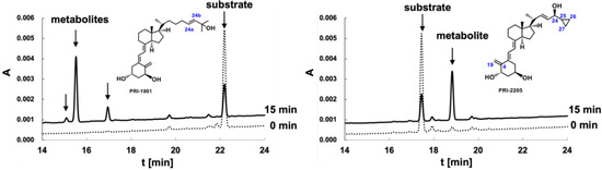 The membrane fraction prepared from the recombinant Escherichia coli cells that expressed hCYP24A1 [25,26] was used to examine the metabolism of 1,25Ds, as previously done for the 1,25D2 analogs. The HPLC metabolic profiles of PRI-1901 and PRI-2205 are shown in Figure 8.