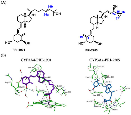(A) Structural formulas of the analogs of 1α,25-dihydroxyvitamin D3 (PRI-1901 and PRI-2205). (B) Molecular interactions between 1,25D3 analogs (PRI-1901 and PRI-2205) and CYP3A4 resulting from MD simulations. Hydrophobic interactions are shown as magenta dashed lines and hydrogen bonds as green.