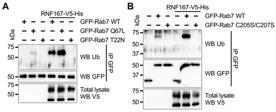Rab7 is known to switch between an inactive GDP-bound state and an active GTP-bound state that regulates its recruitment to endosomes [2]. Our results thus far suggest that the ubiquitination of Rab7 protein modulates its membrane association; therefore, we investigated whether Rab7’s active or inactive state influences its ubiquitination by RNF167. To this end, we performed a ubiquitination assay in HEK293T cells co-expressing WT RNF167 with either Rab7 WT, the constitutively activated Rab7 Q67L or the inactive dominant-negative Rab7 T22N mutant. The results showed that Rab7 Q67L is ubiquitinated by RNF167, with ubiquitination levels higher than WT Rab7 (Figure 3A), which contrasts with the inactive Rab7 T22N mutant that is not ubiquitinated by RNF167. Reproducibly, the ubiquitination of Rab7 Q67L was detected even in the absence of RNF167 exogenous expression (Figure 3A). These results suggest that Rab7 must be in an active state for its ubiquitination by RNF167. It remained unclear, however, whether Rab7 membrane association is part of the mechanism leading to its ubiquitination, or a consequence of being anchored at the membrane. C-terminal Rab7 amino acid residues C205 and C207 are known to be modified with geranyl–geranyl hydrophobic moieties that are required for Rab7 anchoring on endosomal membranes [44]. Therefore, to determine whether Rab7 ubiquitination mediated by RNF167 depends on membrane anchoring, HEK293T cells were transfected with a plasmid encoding either Rab7 WT or the C205S/C207S variant that cannot be anchored at the membrane [16]. After Rab7 IP and subsequent anti-UB immunoblot, the results showed that the Rab7 C205S/C207S mutant is not ubiquitinated by RNF167, suggesting that ubiquitination occurs after the membrane anchoring of Rab7 (Figure 3B). Together, these results indicate that Rab7 must be in an active state and anchored at the membrane for its RNF167-mediated ubiquitination.