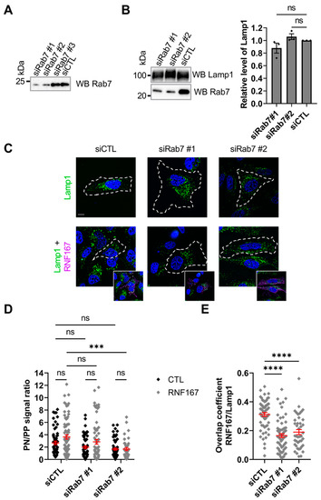 Recent studies have shown that RNF167 controls lysosome trafficking and positioning [41,45]. Rab7 is also involved in perinuclear lysosome positioning [13]; therefore, we investigated whether Rab7 could influence the RNF167-mediated positioning of lysosomes. To test this hypothesis, we used Dicer-Substrate Short Interfering RNAs (DsiRNAs) against human RAB7A in HeLa cells. Results from specific immunoblotting against endogenous Rab7 protein show that DsiRNA #1 and #2 were the most efficient at reducing Rab7 protein abundance (Figure 4A). Specific immunoblotting shows that reduction in the Rab7 protein level does not alter the total protein level of endogenous lysosomal marker Lamp1 (Figure 4B). Using immunofluorescence, we tested whether Rab7 is required for RNF167-mediated lysosome positioning by measuring the position of the Lamp1-lysosomal marker. Overall, the ratios of perinuclear to peripheral Lamp1-positive vesicles show that lysosome positioning is not convincingly affected in Rab7-depleted cells when compared with control cells or in the presence of exogenous RNF167 (siCTL, 2.681 ± 0.274; siRab7#1, 1.985 ± 0.229, p = 0.5781; siRab7#2, 1.686 ± 0.175, p = 0.1624; siCTL + RNF167, 3.639 ± 0.348, p = 0.1694; siRab7#1 + RNF167, 2.857 ± 0.385, p = 0.3571; siRab7#2 + RNF167, 1.684 ± 0.243, p = 0.0003) (Figure 4C,D). To test if the depletion of Rab7 impacts the localization of RNF167 to lysosomes, we determined the Manders’ overlap coefficients for RNF167 and Lamp1. The results show that Rab7 depletion decreases the overlap between RNF167 and Lamp1 (siCTL + RNF167, 0.312 ± 0.014; siRab7#1 + RNF167, 0.166 ± 0.014, p < 0.0001; siRab7#2 + RNF167, 0.190 ± 0.018, p < 0.0001) (Figure 4E), suggesting that Rab7 regulates RNF167 localization in Lamp1-positive vesicles.