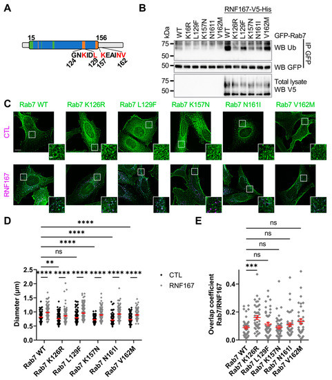 Charcot–Marie–Tooth Type 2 subtype B (CMT2B) disorder is due to genetic alteration in the RAB7A gene [46]. The genetic alterations generate protein variants surrounding the GTPase domain of Rab7 (Figure 6A). Accordingly, studies reported that Rab7 CMT2B variants exhibit an altered affinity towards GTP and GDP, leading to a higher rate of GDP/GTP exchange and increased GTP hydrolysis [47,48,49]. Our results shown in Figure 3A suggested that Rab7 GTPase activity is required for its RNF167-mediated ubiquitination; therefore, we investigated whether RNF167-mediated ubiquitination of Rab7 is affected in CMT2B variants. HEK293T cells were transfected with plasmids encoding GFP-tagged Rab7 WT or CMT2B variants in the presence or absence of exogenous RNF167. After lysis, an anti-GFP immunopurification of Rab7 proteins was performed from the total cell lysate before the IP complexes were resolved on SDS-PAGE and immunoblotted against UB. The results show that RNF167-mediated ubiquitination of Rab7 CTM2B variants was reduced when compared with RNF167-mediated ubiquitination of WT Rab7 (Figure 6B). This indicates that the tested CTM2B variants exhibit impaired ubiquitination. We have demonstrated that RNF167-dependant ubiquitination of Rab7 leads to vesicle enlargement (Figure 2F); therefore, we first determined the diameter of CTM2B-variant-positive vesicles co-transfected with a control vector in HeLa cells. As expected for mutants with putative reduced ubiquitination, vesicles positive for Rab7 CMT2B variants, but not Rab7 L129F, were significantly smaller than those of Rab7 WT (WT, 0.815 ± 0.008; K126R, 0.759 ± 0.008, p = 0.0026; L129F, 0.791 ± 0.010, p = 0.8835; K157N, 0.723 ± 0.007, p < 0.0001; N161I, 0.712 ± 0.010, p < 0.0001; V162M, 0.727 ± 0.008, p < 0.0001) (Figure 6C,D), indicating that expression of Rab7 CMT2B variants led to smaller vesicles. In contrast, the co-expression of RNF167 with either Rab7 WT or CTM2B variants in HeLa cells significantly enlarged the vesicles compared with conditions without RNF167 (WT + RNF167, 0.978 ± 0.011, p < 0.0001; K126R + RNF167, 0.859 ± 0.014, p < 0.0001; L129F + RNF167, 0.957 ± 0.013, p < 0.0001; K157N + RNF167, 0.893 ± 0.010, p < 0.0001; N161I + RNF167, 0.924 ± 0.013, p < 0.0001; V162M + RNF167, 0.896 ± 0.011, p < 0.0001) (Figure 6C,D). These data support the idea that RNF167 could restore the defect in vesicle size of many Rab7 CMT2B variants. Finally, the Manders’ overlap coefficient between Rab7 CMT2B variants and RNF167 showed that only the Rab7 K126R mutant had a higher colocalization with RNF167 than Rab7 WT or any other CMT2B variant (WT, 0.089 ± 0.010; K126R, 0.161 ± 0.014, p = 0.0002; L129F, 0.114 ± 0.012, p > 0.9999; K157N, 0.090 ± 0.010, p > 0.9999; N161I, 0.109 ± 0.012, p > 0.9999; V162M, 0.133 ± 0.018, p = 0.4185) (Figure 6E).