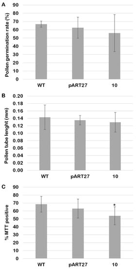 2.2. Pollen Viability Is Affected by the Expression of CcASP-RICH but Not Pollen Tube Elongation