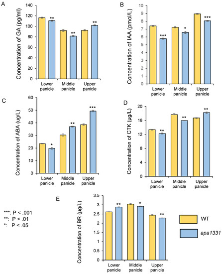 Comparative analysis of phytohormones in different parts (lower, middle, and upper) of the 6 cm panicle wild type (yellow) and apa1331 (blue); gibberellic acid (A); indole 3 acetic acid (B); abscisic acid (C); cytokinin (D); and brassinosteroids (E). A Student’s t-test was used to analyze the significance of data, presented as mean ± standard deviation, where asterisks *, **, and *** show that p < 0.05, p < 0.01, and p < 0.001, respectively.