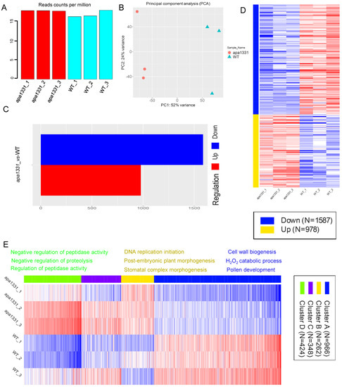 Identification of DEGs in WT and apa1331. Read counts per million (A); principal component analysis (B); difference between the number of up- and downregulated genes (C); heat map displaying the clustering analysis of DEGs in up and downregulation (D); heat map displaying the expression of DEGs based on k-means enrichment analysis (E).