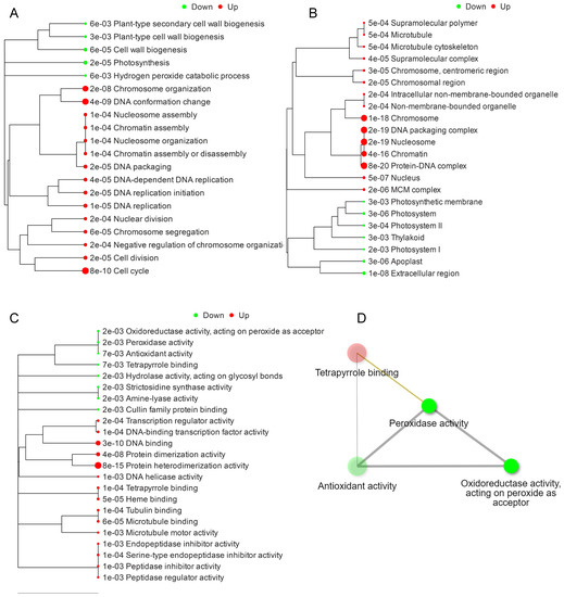 Significantly enriched cellular components associated with these DEGs were mainly downregulated in terms of extracellular components, apoplast, thylakoid, and photosystem and upregulated in terms of protein DNA complexes, non-membrane-bounded organelles, and microtubules (Figure 3B). Significantly enriched molecular functions associated with these DEGs were downregulated in terms of antioxidant activity and peroxidase activity and upregulated in terms of protein heterodimerization activity, serine endopeptidase inhibitor activity, and DNA binding (Figure 3C). The interaction network of GO terms associated with DEGs was majorly related to the downregulation of peroxidase activity, antioxidant activity, and oxidoreductase activity and the upregulation of the tetrapyrrole groups.
