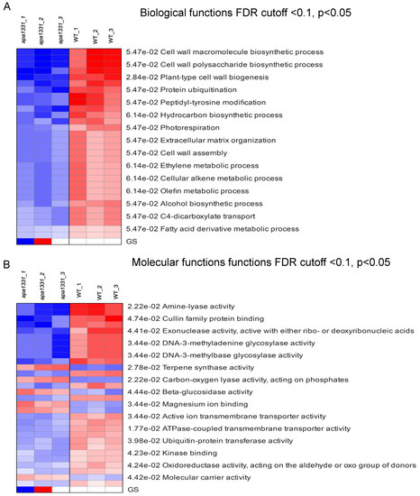 The KEGG expression of DEGs across all the samples of WT and apa1331 were identified using PGSEA at FDR cutoff < 0.1 and p < 0.05 [35]. PGSEA can be used to identify the list of genes that were downregulated in a specific dataset.. It displays the FC activities of genes compared to their mean, in terms of z-score, in a specific pathway. Pathway analysis revealed that the gene-regulating cell wall macromolecules biosynthetic processes, cell wall polysaccharides biosynthetic processes, and plant-type cell wall biogenesis were downregulated in apa1331. These results are consistent with the enrichment analysis (Figure 4A). In addition, the DEGs are related to fatty acid derivative metabolic processes and other organic metabolites. Notably, using the criteria mentioned above, PGSEA did not yield a set of genes related to any specific cellular components. Pathway analysis of molecular functions revealed the downregulation of amine-lyase activity, cullin family protein binding, and exonuclease activity, active with either ribo or deoxyribonucleic acid (Figure 4B). Meanwhile, terpene synthase activity, carbon-oxygen lyase activity, phosphate activity, β-glucose activity, and magnesium ion binding were found to be upregulated in apa1331 compared to WT.