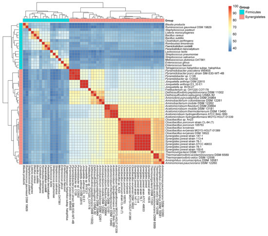 A heat map showing the identity between the CodY/CodY-like proteins from species of Firmicutes and Synergistetes. The score is the % identity of the deduced amino acid sequence of codY and its homologs.