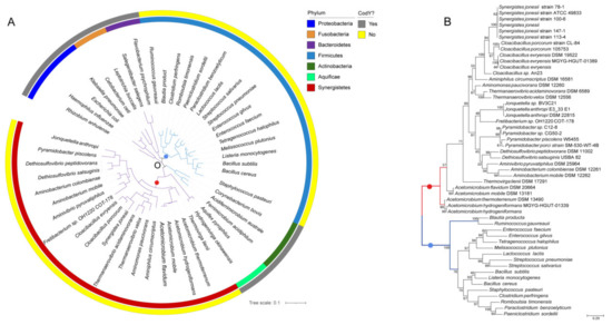 The 16S rRNA genes from 35 strains of the phylum Synergistetes (Table 1), 17 species of the Firmicutes (Table S2) and 12 species from the phyla Proteobacteria, Fusobacteria, Bacteroidetes, Actinobacteria and Aquificae (Table S3) were retrieved from the database. An alignment of these 16S genes was performed using ClustalW integrated in MEGA version 7 [54] with standard parameters. The sequences of the codY genes from species of Synergistetes and Firmicutes were retrieved from the database, and an alignment of the deduced protein sequence was prepared using MUSCLE [55] integrated into MEGA version 7 with standard parameters. The maximum likelihood algorithm (ML) with 1000 bootstrap replications was used for phylogenetic tree reconstruction. The phylogenetic tree was managed and visualized by iTOL, version 5 [56].