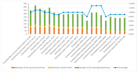 The distribution of genes regulated by the CodY-like protein in the available genomes of the phylum Synergistetes. The number of loci that harbor the canonical CodY box, the newly defined extended palindromic sequence, and both motifs in the promoter regions are shown in orange, green and light orange, respectively. The percentages of total targets in the genomes are indicated.