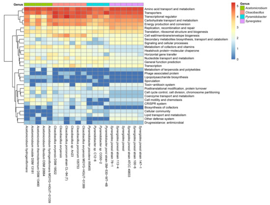 A pathway-enrichment heat map showing the clustering of loci regulated by the CodY-like protein. The positions of the four genera are color-coded and listed on the top of the figure. The number of loci regulated by the CodY-like protein was analyzed based on the predicted function. The number was converted using log2 (N + 1), where the N is the number of the identified target genes.