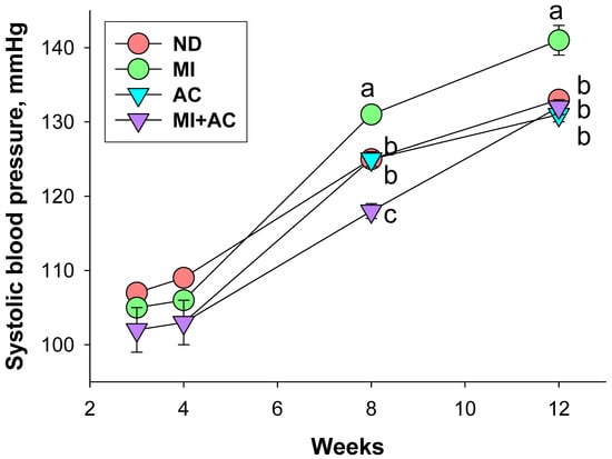 Effect of minocycline administration (MI) and acetate supplementation (AC) on systolic blood pressure in offspring from 3 to 12 weeks of age (n = 7–8/group). The letters a, b, and c denote significant differences between groups (p < 0.05, two-way ANOVA). ND = rats received vehicle (control); MI = rats received minocycline; AC = rats received acetate; MI + AC = rats received minocycline and acetate administration.