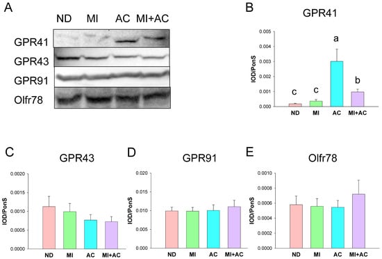 Representative Western blots and relative abundance of (A) short-chain fatty acid (SCFA) receptor, (B) G protein-coupled receptor 41 (GPR41), (C) GPR43, (D) GPR91, and (E) olfactory receptor 78 (Oflr78) in 12-week-old offspring kidneys (n = 7–8/group). The letters a, b, and c above the bars denote significant differences between groups (p < 0.05, one-way ANOVA). ND = rats received vehicle (control); MI = rats received minocycline; AC = rats received acetate; MI + AC = rats received minocycline and acetate administration.