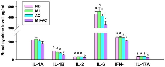 We measured cytokines interleukin (IL)-1A, IL-1B, IL-2, IL-6, IL-17A, and interferon-γ (IFN-γ) in the offspring kidneys. As shown in Figure 3, the renal level of IL-1A was not different among the four groups. IL-1B and IL-6 levels were lower in the MI + AC group compared to the ND and MI groups. Additionally, renal IL-2, IFN-γ, and IL-17A levels were lowest in the MI + AC group compared to the other three groups.