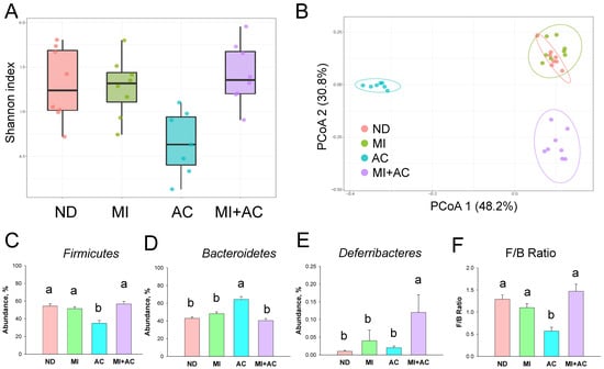 Effect of minocycline administration (MI) and acetate supplementation (AC) on the gut microbiota in 12-week-old male progeny: (A) α-diversity using the Shannon index; (B) β-diversity using principal coordinate analysis (PCoA); phylum level relative abundance of (C) Firmicutes, (D) Bacteroidetes, and (E) Deferribacteres; (F) the ratio of Firmicutes to Bacteroidetes (F/B) (n = 7–8/group). The letters a and b above the bars denote significant differences between groups (p < 0.05, one-way ANOVA). ND = rats received vehicle (control); MI = rats received minocycline; AC = rats received acetate; MI + AC = rats received minocycline and acetate administration.